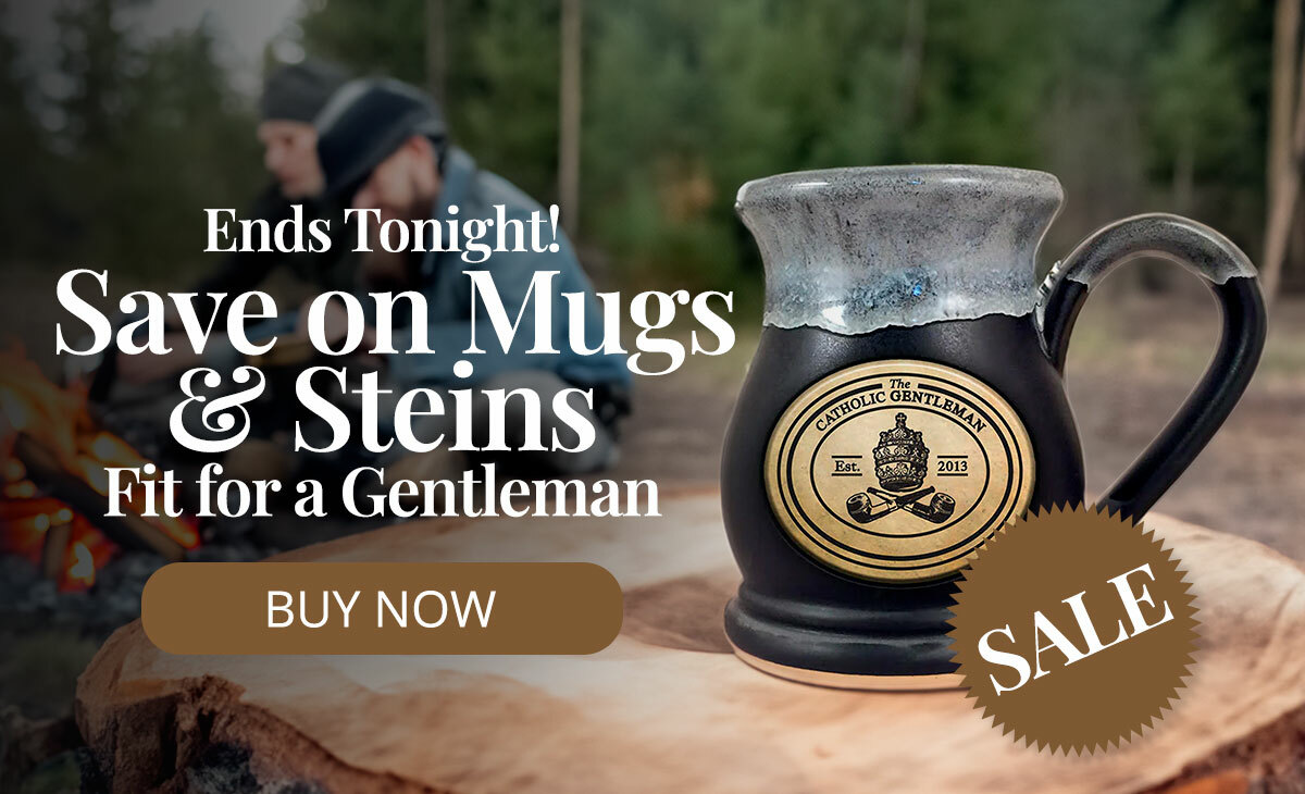 This exclusive sale ends this evening. | | | | Order today to get these discounts: | | | | | | Save $5 off a single mug or $25 off a set of four coffee mugs | | | | | | Save $5 off a single stein Get $25 offfour Catholic Gentleman's stoneware beer steins. | | | | Again, this sale only lasts a few more hours. Supplies are going quickly, so grab your mugs and steins today! | | | | © The Catholic Gentleman
