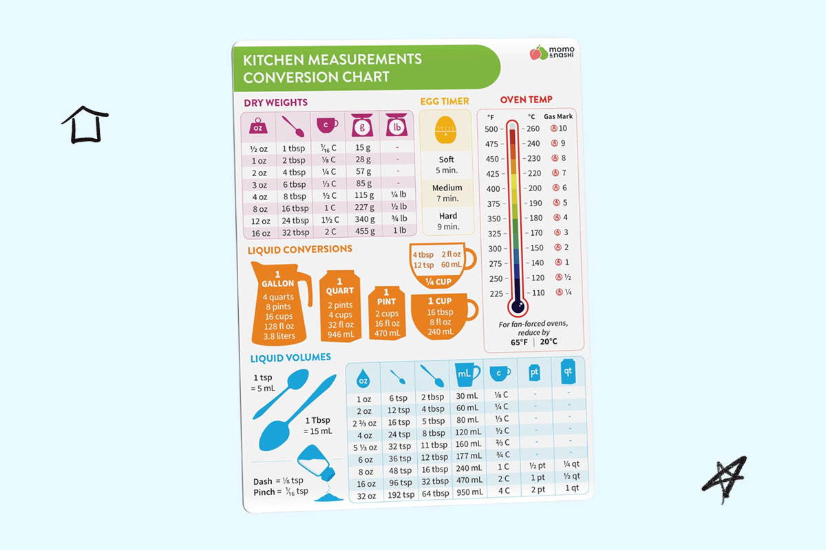 | If you're constantly Googling measurement conversions mid-recipe, this kitchen chart magnet is such a time-saver. It gives you clear, at-a-glance conversions for cups, ounces, grams, and even temperature. Waterproof and sturdy with a strong magnet backing, it stays put on your fridge and wipes clean easily after messy baking days. | |